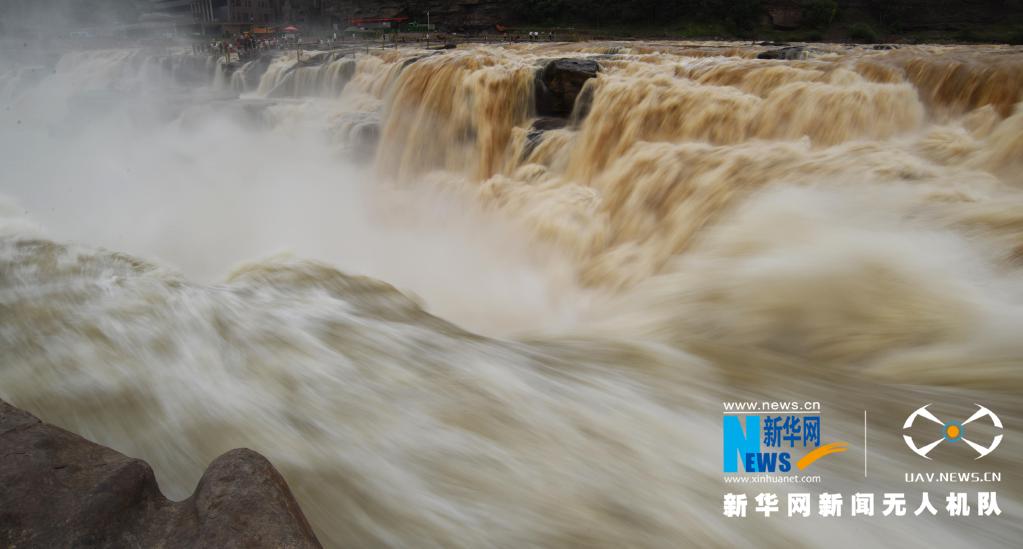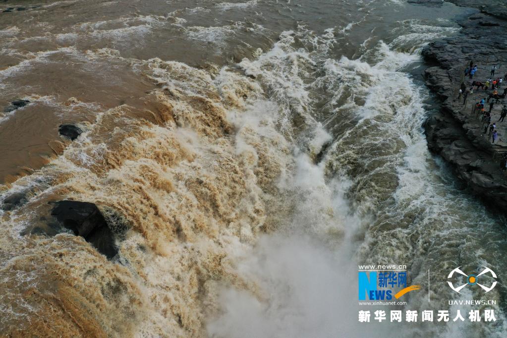 近日,受上游局部地区强降雨影响,黄河壶口瀑布出现“西边浊流翻滚,东边白浪滔滔”的奇特景观。新华网发(吕桂明 摄)